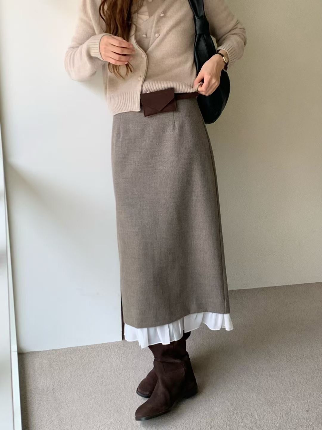 外層微毛呢質地是有挺度,下擺拼接雪紡增添輕盈層次感