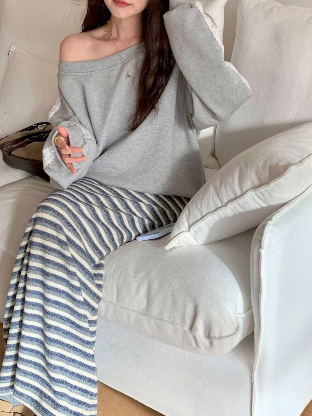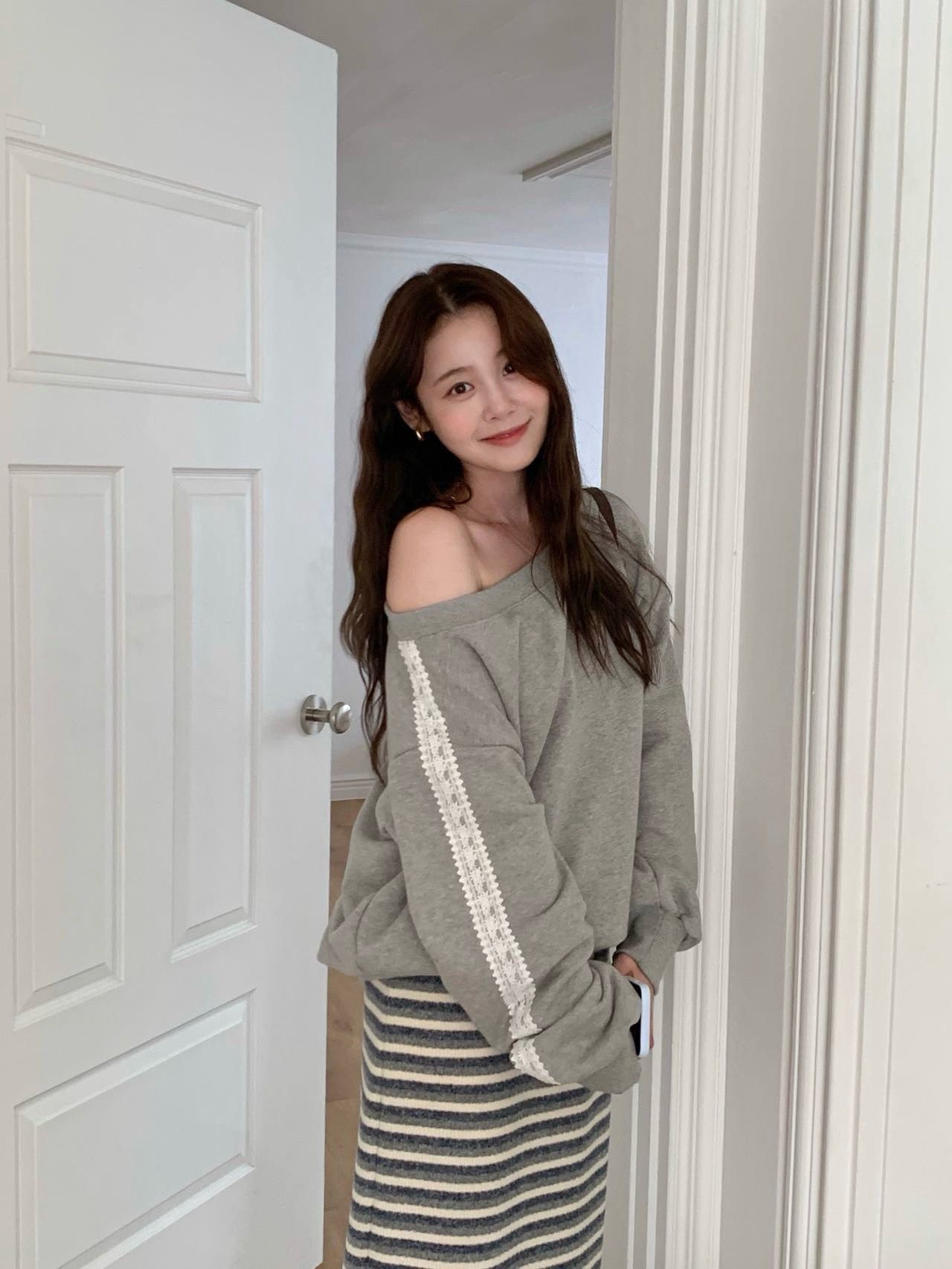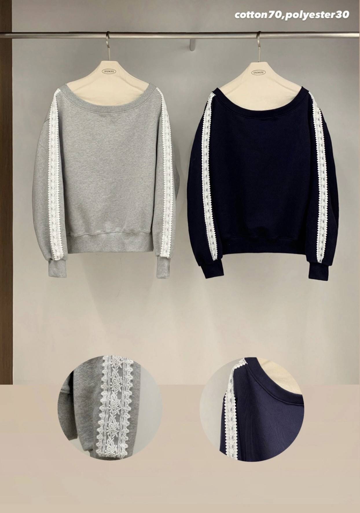 柔軟厚棉混紡的材質,加上落肩剪裁與袖口蕾絲細節