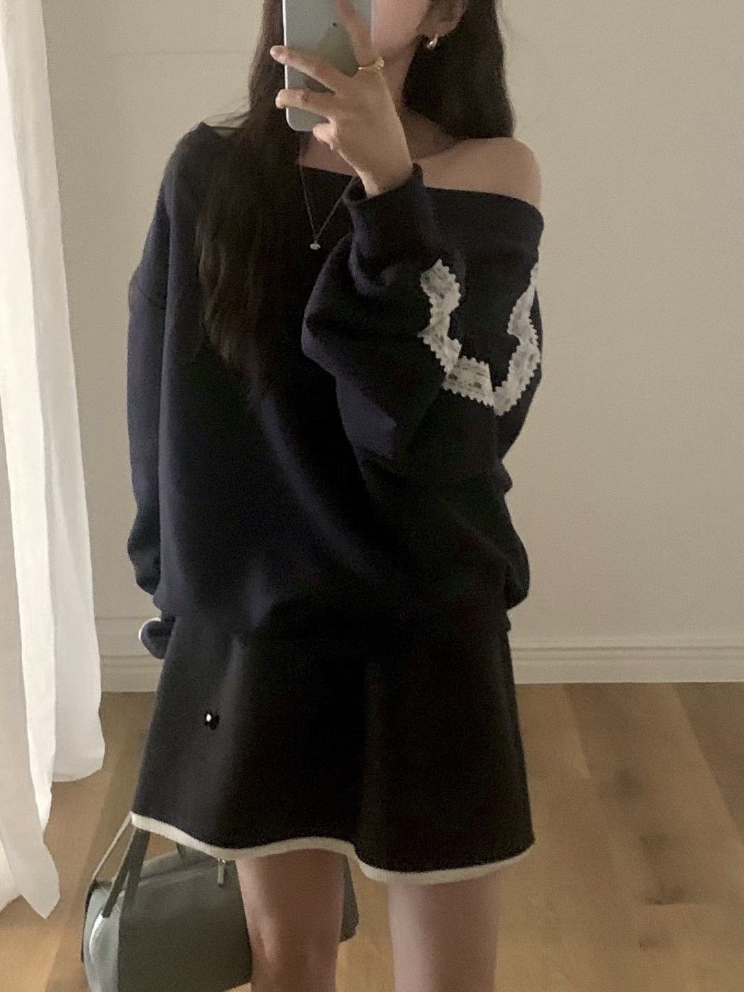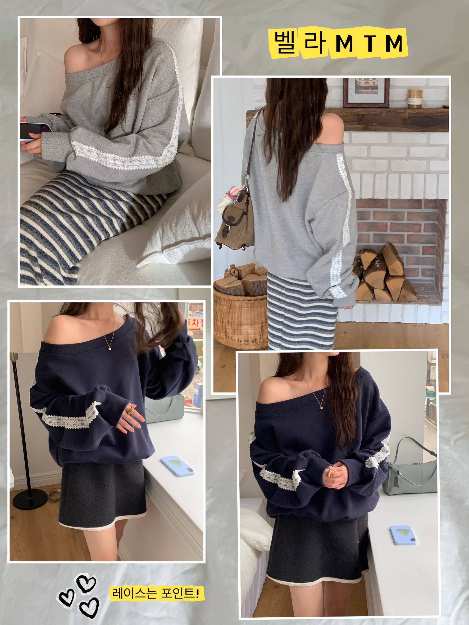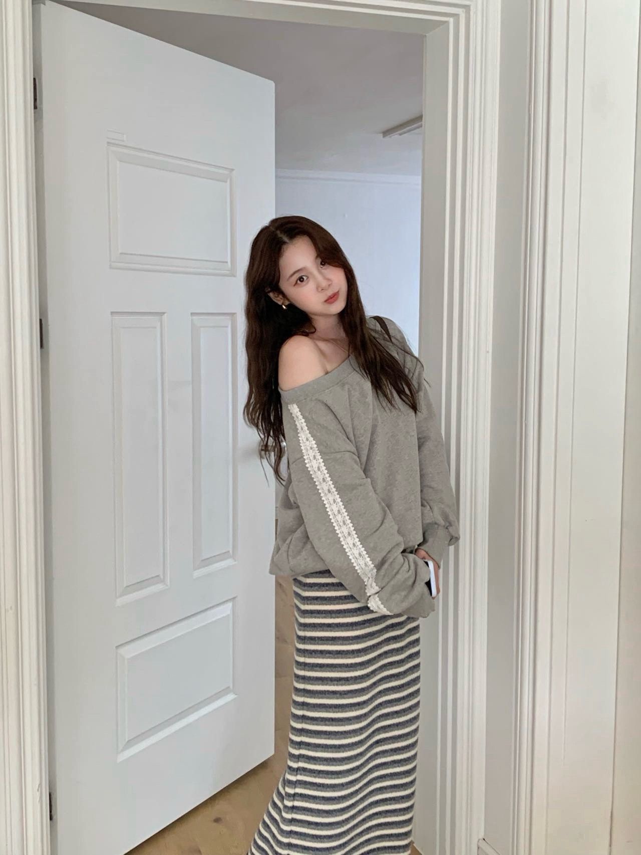 柔軟厚棉混紡的材質,加上落肩剪裁與袖口蕾絲細節