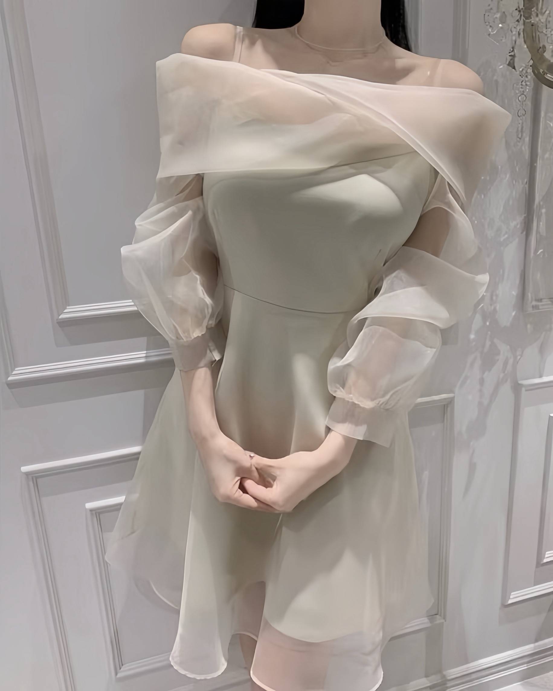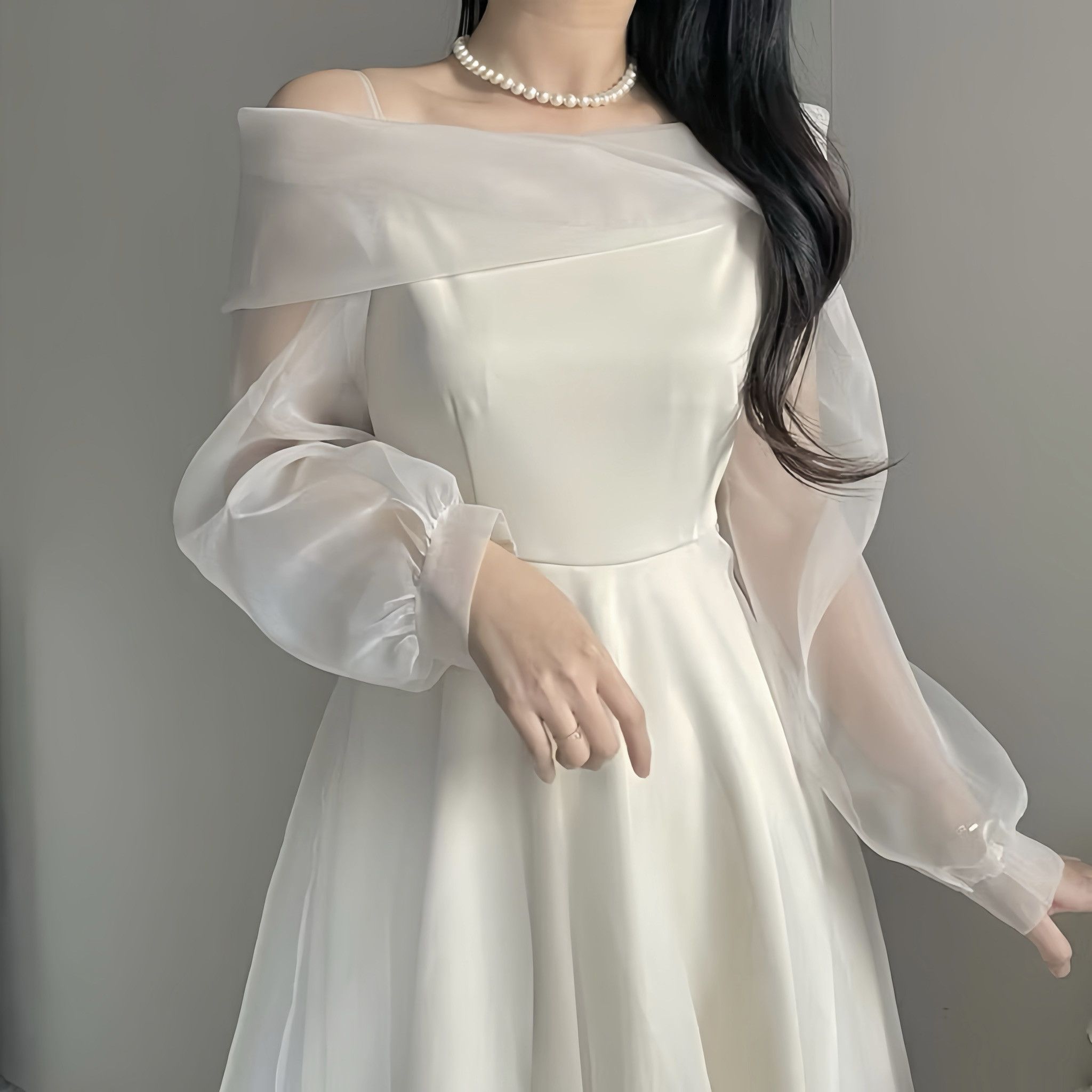 偏挺的歐根紗+斜肩設計